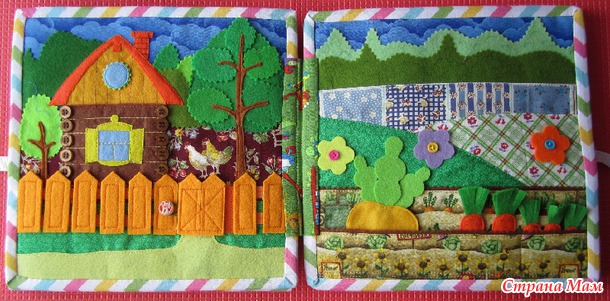 Второй разворот книжки - сказка "Репка". Самое большое дерево имеет карман, калитка открывается, несколько досочек забора на липучке.