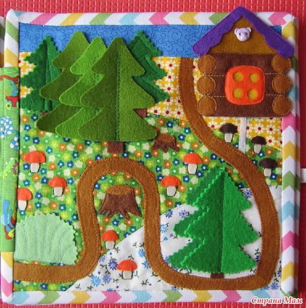 Крепим в лесу при помощи липучки съемный домик, и получаем сказку "Маша и медведь" (это где медведь говорит: "Сяду на пенек, съем пирожок" ).