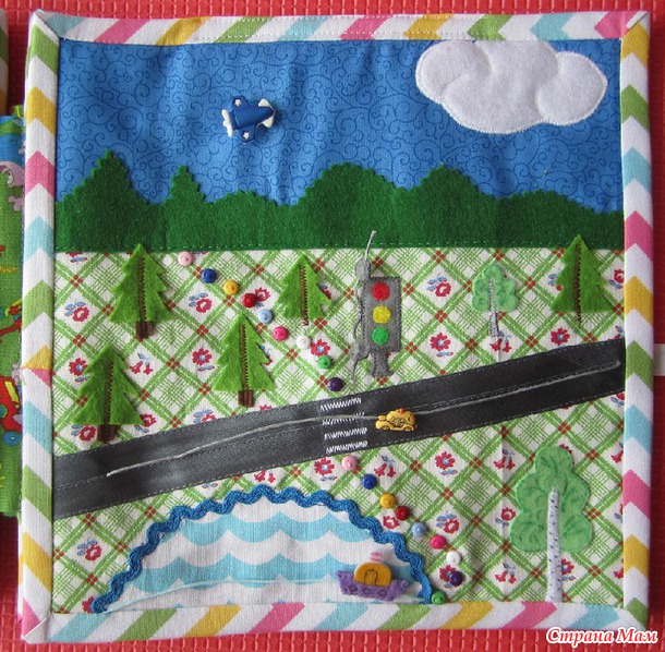 На этой странице транспорт. Самолетик-пуговица пришит, а машинка и пароход двигаются по шнурам. От воды к лесу идет тропинка из пуговиц. У перехода стоит светофор, он в "рабочем состоянии". Елочки - счет до 5-ти, березы - большая и маленькая.
