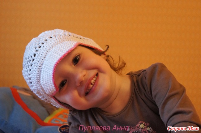 В козырек ничего не вставляла и не крахмалила. Вязала по схеме начиная с ряда у убавками.