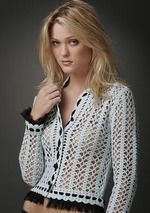 и главное здесь наверно даже не только узор, но и отделка кофто4ки бахромой. опять же контраст цвета, белого и 4ерного, все это придает своеобразный шарм модели, ну и коне4но же сама девушка...
