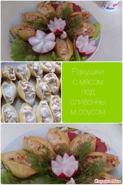 Далее начиняем ракушки фаршем и сверху поливаем соусом.
