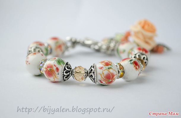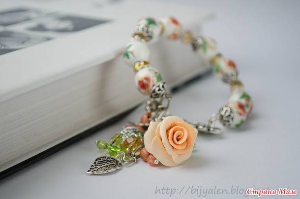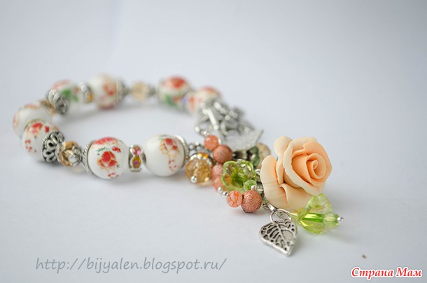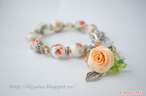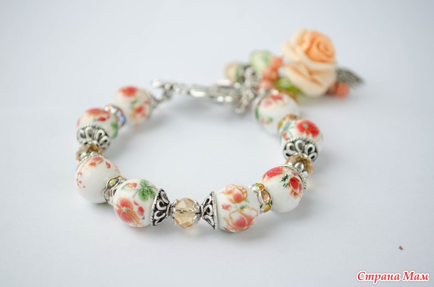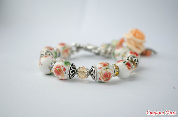 Чудесного качества фарфоровые бусины, стеклянные и со стразами, браслет держит форму и застегивается на застежку-тогл. На кисточке - "сахарные" бусинки, акриловые цветочки и розочка абрикосового цвета ручной работы из полимерной глины.
