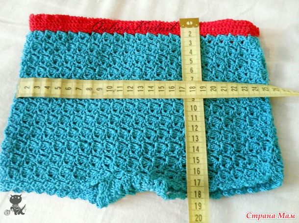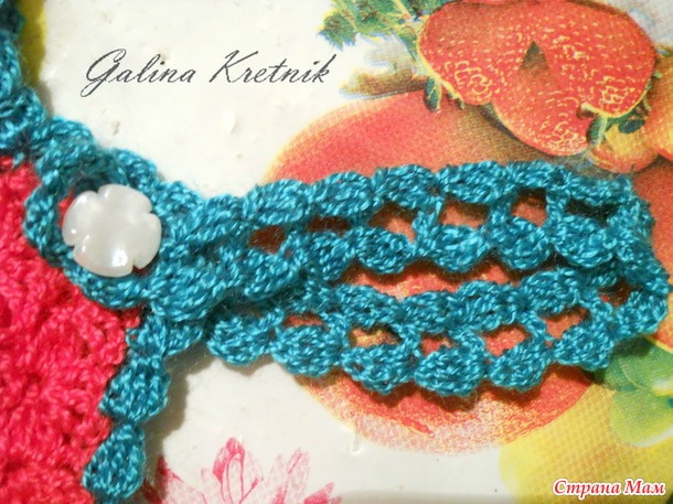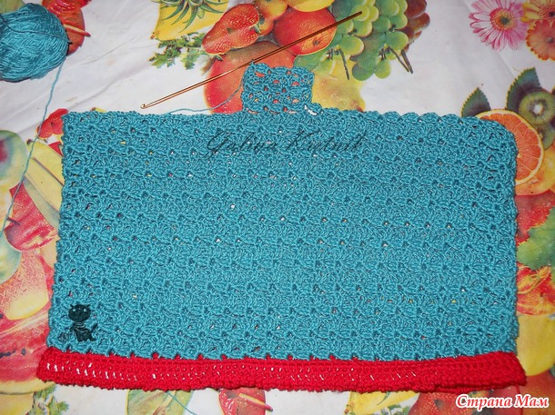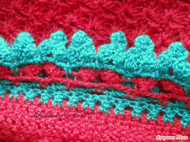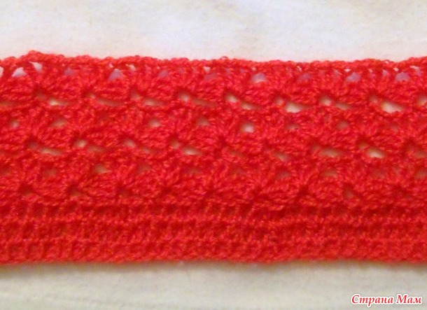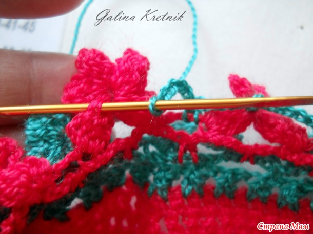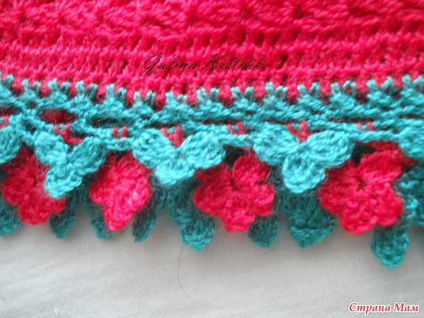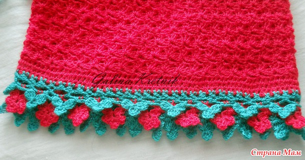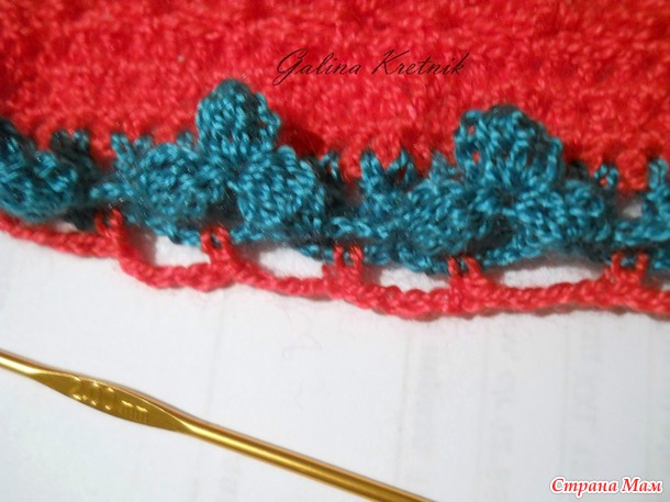 показала, что длина достаточная, поэтому приступаю к обвязке красными ниточками узором цветочки.