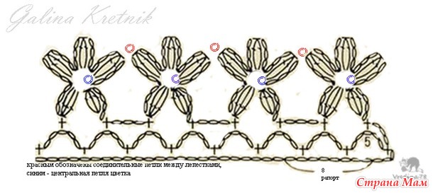 Далее вяжем ряд цветочков по схеме, располагая цветочки так, чтобы они "выглядывали" между трилистников. Вот что получится