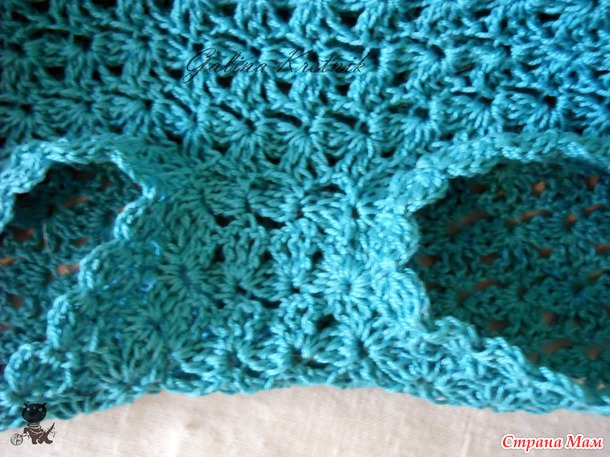 Для переда от бока отсчитала 3 веерка, присоединила нитку и в 4-й начала вязать ряд пышных столбиков. У меня получилось 12 столбиков - 14 см. С другого бока тоже отступ - 3 веерка. Провязала в высоту 4 ряда (2 см), последний ряд - веерки. Нить оборвала. Спинка вяжется аналогично.
