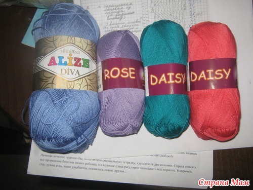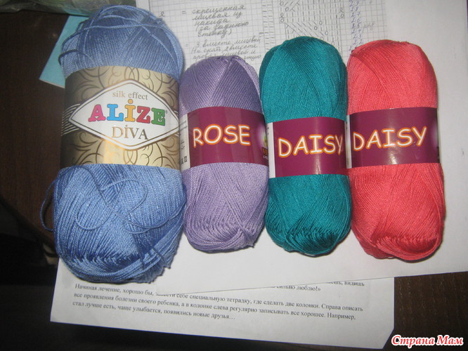 зеленая (6,5 мотков) и коралловая (5 мотков) (Vita cotton Daisy 50 г/295 м)...еще не решила. Мечусь между сиреневой (ее с избытком) и зеленой ( думаю как раз хватит 6,5 мотков).
