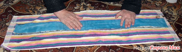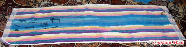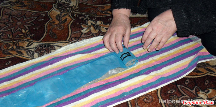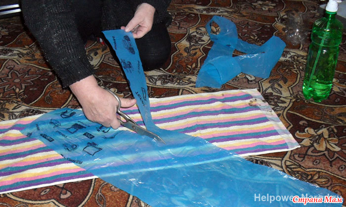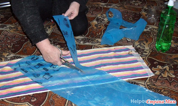 Нарезаем полоски полиэтиленовой пленки (годится любая - из пакетов, остатки старой от парника): ширина 10 см., длина произвольная.