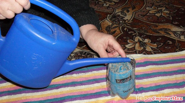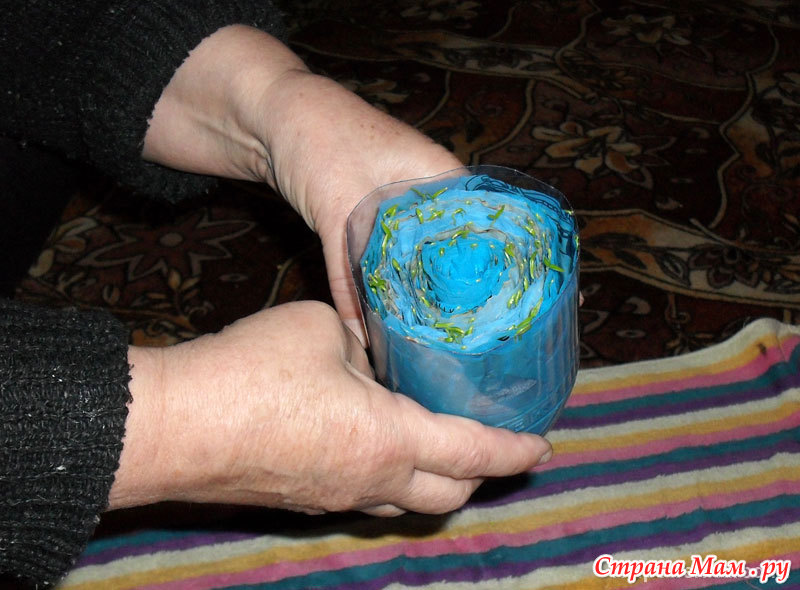 Затем вставляем рулончик в стакан семенами к верху. Вместо стакана можно использовать обрезаную бутылку из под газированной воды.