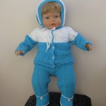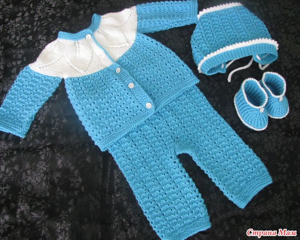 Связался костюмчик для малыша 6 месяцев. Ниточки Ярнарт Бэби 50 г/150м. Ушло почти 5 моточков бирюзы и 1 белой.