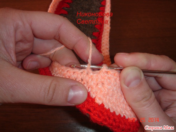 Нить не обрываем когда мысок довяжем, на другом сапожке начинаем новый моточек.