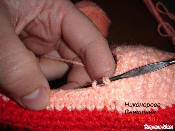 Вяжем столбиками без накида, прямыми и обратными рядами, соединяя с петлями мыска соед столб крайние петли(смысл тот же что и привязании мыска, только без прибавок)