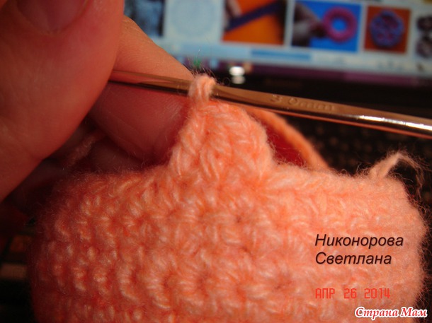 Делаем кольцо,(персик нить)вяжем 10 столбиков без накида, соединяем,