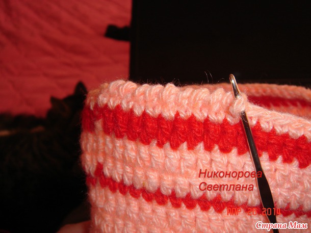 Вяжем столбиками без накида в заднюю стенку петли, вязание продолжаем по кругу.