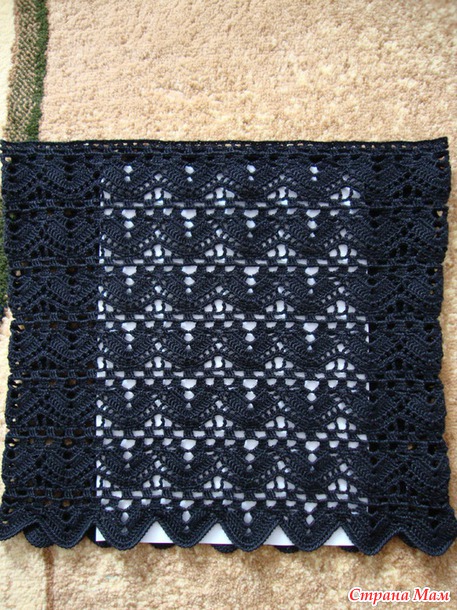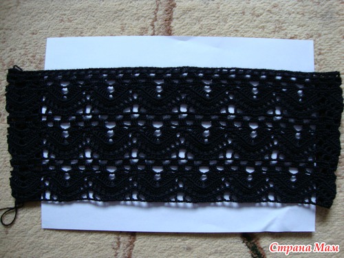 В следующих 2х узорах делаем прибавление – сколько прибавлять – пробуйте и смотрите сами, ориентируясь на это фото. Дальше примеряем к выкройке и от 3го клубка еще вяжем недостающее количество соединительных воздушных петель обязательно, чтобы был соблюден раппорт узора.