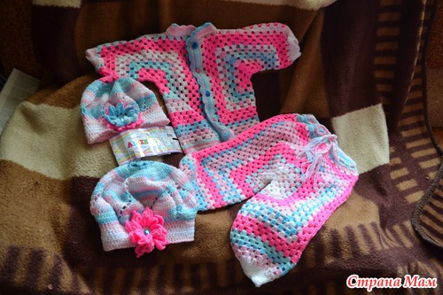 Связала беби-сюрприз кофту и штанишки для 4-х месячной внучатой племянницы (вроде так называется дочка племянницы?). Пряжа Ализе Беби-батик Шекерим, около 200 гр, крючок 2,5.