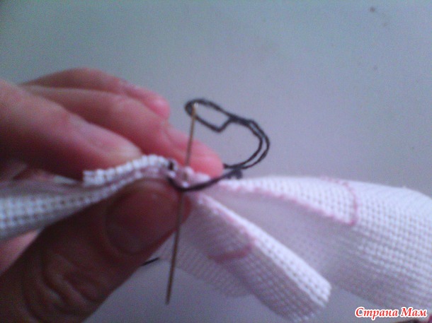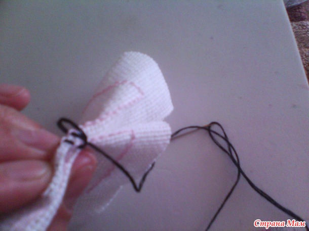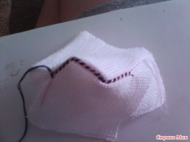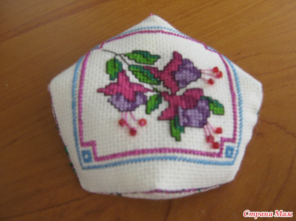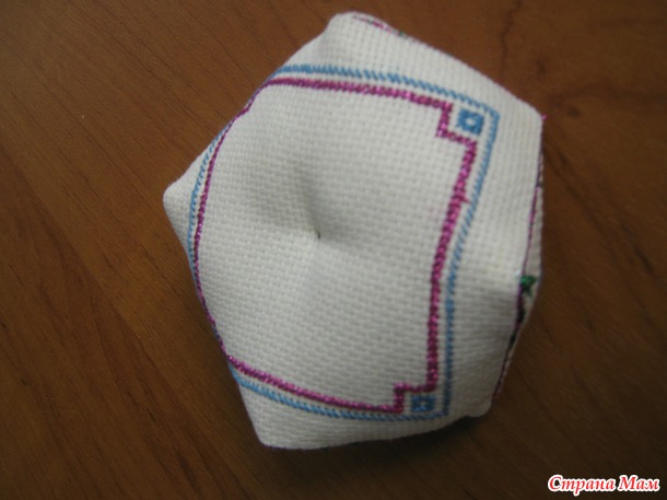 когда большая часть будет зашита, оставляем небольшой кусочек, для того чтобы набить нашу кривульку. Хорошо наполняем углы, но не перетрудитесь. что бы она не была слишком упругая. и зашиваем оставшийся фрагмент. вот и все бискорню готова. Так же посередине ее можно стянуть ниткой, а можно оставить выпуклую