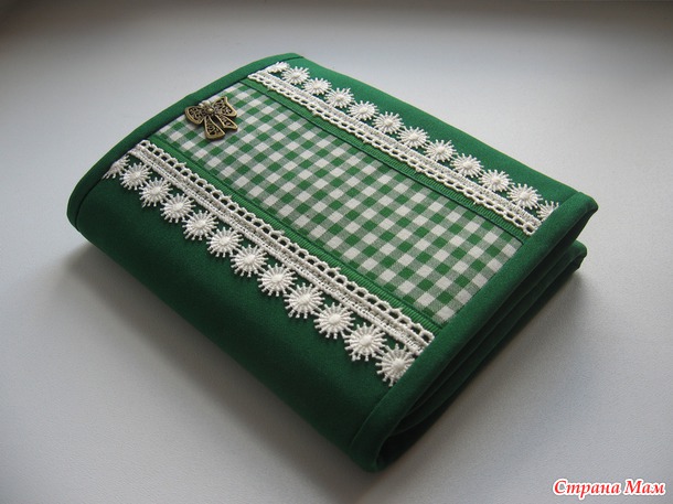 Материалы- габардин, американский хлопок, лента, кружево. Уплотнен дублерином и синтепоном. Размеры в сложенном виде- 16 см х 14 см, в разложенном- 16 см х 56 см.