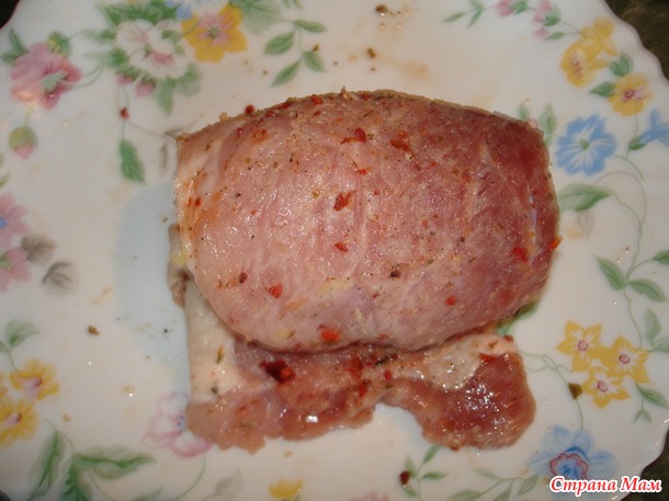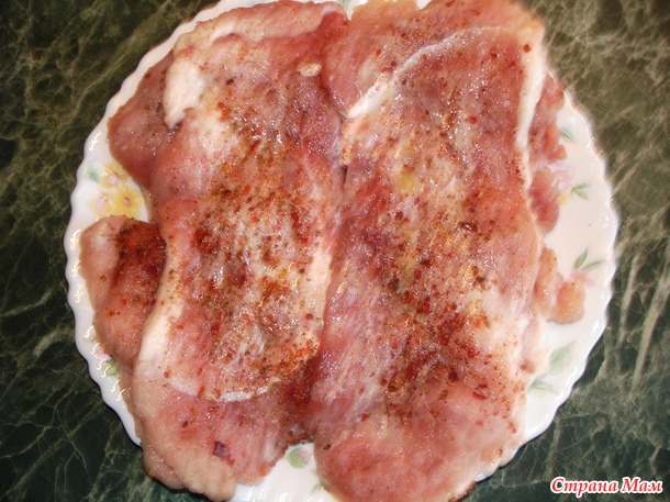 Мясо нарезала длинными пластинами в палец толщиной (6 ломтиков получилось). Тщательно его отбила, посолила, поперчила, добавила букет любимых специй, хорошо сбрызнула лимоном, выложила на блюдо и оставила мариноваться примерно на час