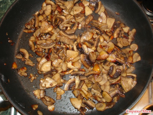 Отправляем в разогретую до 200 градусов духовку. Переходим к соусу. Грибы мелко порезать и обжарить в сливочном масле