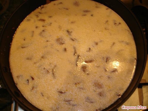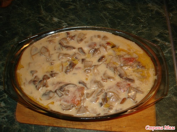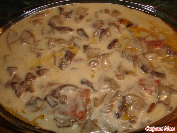 Вылить полученную смесь на грибы, тщательно перемешать