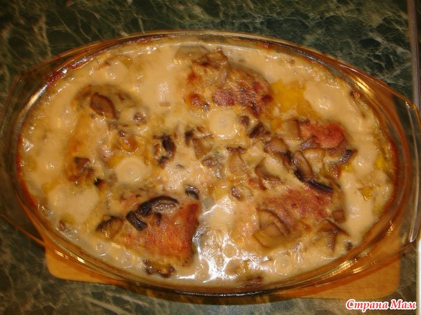 Меж тем мяско "сидит" в духовке уже минут 30, достаем его и заливаем грибным соусом
