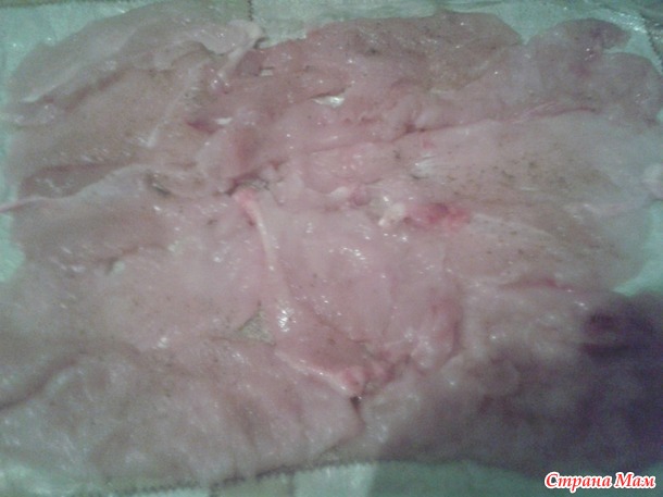 Грудку разрезаем на три части вдоль и отбиваем. На пищевую пленку или целлофановый пакетик выкладываем кусочки грудки что бы не было просветов. Посыпаем солью, перцем, кориандром