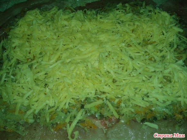Затем выкладываем сыр натёртый на крупной тёрке