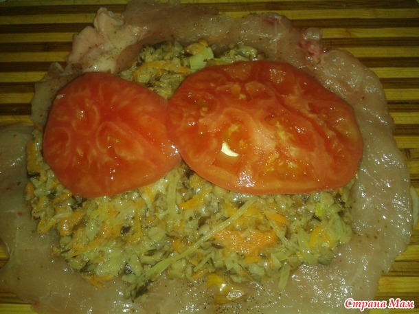 Потом помидор. Но так как я забыла о помидорках когда делала большой рулет