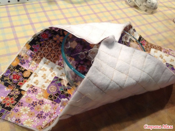 Когда готовилась к проведению этого СП, наткнулась вот на такие прихватки и сначала проигнорировала, но в голове всё-таки что-то осело. На следующий день, на работе, стала варить пельмени в микроволновке (у меня в морозилке лежит запас на чёрный день), а потом плясала на одной ноге пытаясь вытащить готовый продукт обжигаясь. Вчера сшила на скорую руку (косяков полно) и так мне это дело понравилось, что решила поделиться сразу, не дожидаясь чистового варианта. СУПЕР удобно.