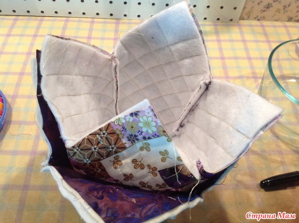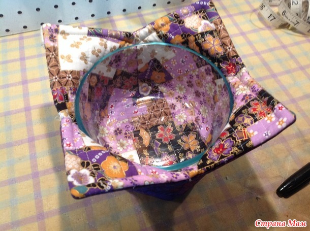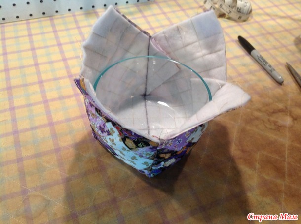 Берём один из простроченных квадратов, кладём его лицевой стороной вверх, ставим ровно по середине нашу плошку и подкалываем временно уголки