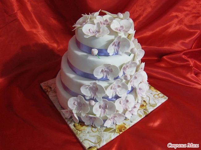 , но потом решили что 15 хватит. Я вообще такой вес не делала, разок был тортик трех ярусный на 8 кг. Дизайн я предложила сама и угадала. Оформление свадьбы в цвете сереневый с белым и орхидеи. Цветочки на тортик все вырезала сама, вырубок нет. Немного замучилась. Но результатом я довольна, И заказчица тоже.