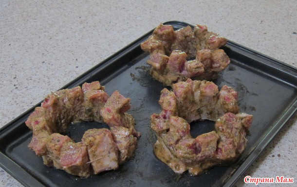 Поставила на противень, сделав круг. Косточки немного наклонить вперед, а мяско наоборот назад, для этого и надрезала слегка, еще чуть прихватила ниткой, чтобы не упали пока делаются.