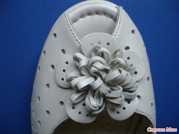 украшены вот таким цветочком, кожа лежит прекрасно, аккуратно, лепестки никуда не скручиваются, а сам цветок закреплен не на скобу, как это последнее время сплошь и рядом, а аккуратно пришит, на ноге этот шов не ощущается никак. Очень достойный вариант, хоть на даму в возрасте, хоть на будущую мамочку, хоть для прогулок мамы с детками.