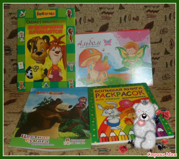 Книжка с наклейками, цветная бумага, альбомчик и большущая раскраска: