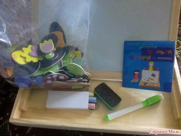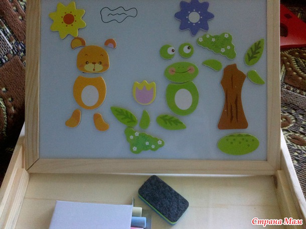 А вообще прикольная! В комплекте 3 цветных мелка, двухсторонняя стерка, фломастер, книжка с идеями и много-много всяко-разых магнитиков. Я сама с удовольствием повозилась с такой игрушкой)))