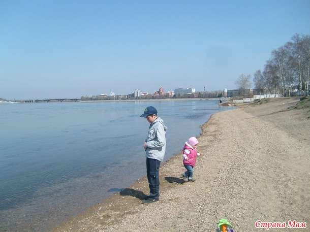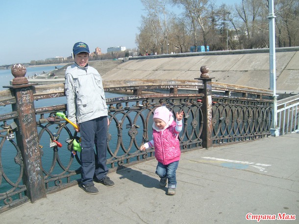 . Дети на перегонки рванули вдоль набережной. Маленькая в полном восторге была от того, что столько места "для побегать от души". Добежали до детской площадки. Повисли на качелях-каруселях. Посчитали на счётах.Отправились дальше. Мостик к о. Юность (на Ангаре).