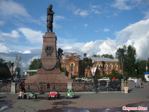 Вышли на улицу. покормили птичек. Маленькая "засыпала на ходу", у меня были тайные мечты, что она уснёт на лавочке, а мы со старшим книжки почитаем-отдохнём. Мечтам не суждено было сбыться. Добрели до памятника Александру III (который, на наше счастье, издал указ о строительстве Сибирской железной дороги, которая теперь ВСЖД, почему собственно и памятник в Иркутске стоит).