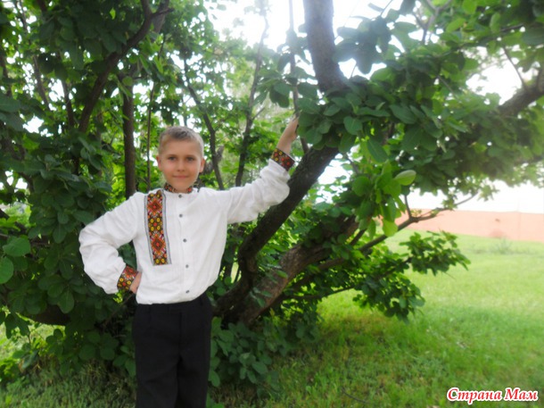Долго просил у меня сынка, чтобы вышила ему рубашку. И всегда начало работы над ней откладывалось на некоторое время. То не было финансовой возможности купить ткань, то были другие более срочные процессы, то не могла определиться с рисунком. Но в ноябре 2013 года случилось - рисунок присмотрела, купила ткань и ниточки. Начала вышивать.