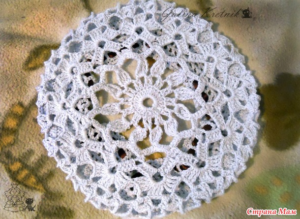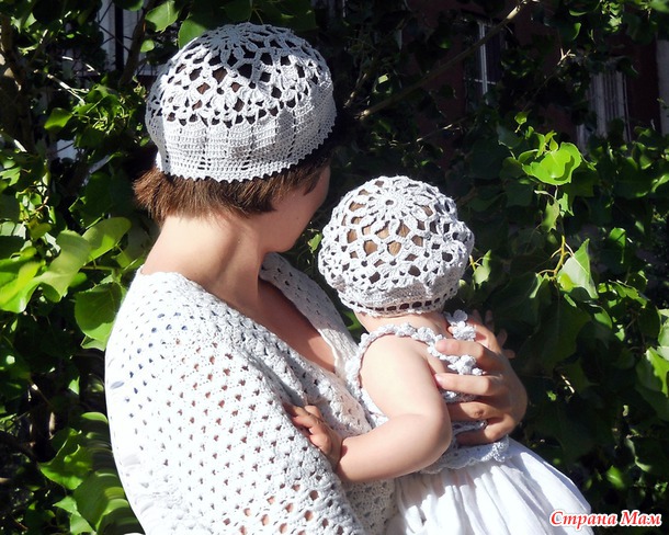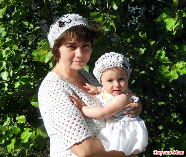 Началом серии стали 2 беретика по одной схеме. Схема салфетки, привожу ниже. Но изменения с 1-го ряда. Так вязала не 32, а 24 ССН, и далее меняла узор под себя. Декор минимальный, мне как-то несолидно уже, а дочка рвёт с корнем все прибамбасы. Себе смастерила цветок из коричневого кружева и бусины, ей просто вставила коричневую ленточку и завязала бантик.