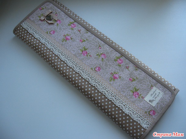 Материалы- американский и итальянский хлопок, лента, кружево. Уплотнен дублерином и синтепоном. Размеры в сложенном виде- 40,5 см х 15 см, в разложенном- 40,5 см х 42,5 см.