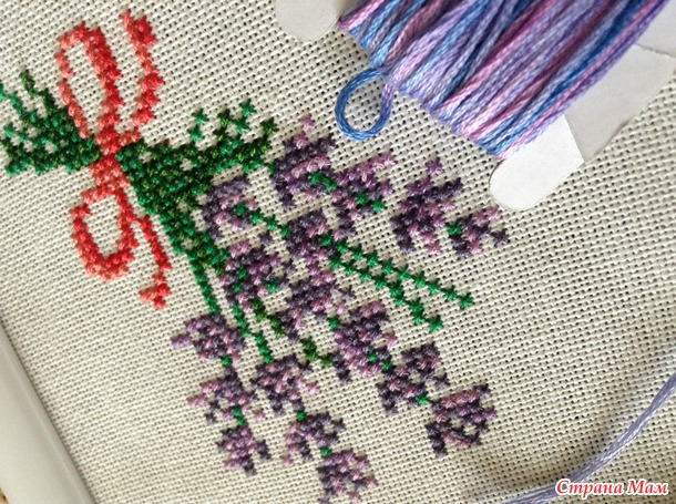 Вышивала я ее на равномерной канве, нитками дмс подбором. Вышивать её было очень легко и в удовольствие. Решила оформить вышивку во что-то прикладное и тут вспомнила про мешочек. Часик потратив на раскрой и сшивания - я получила такой мешочек для нужностей