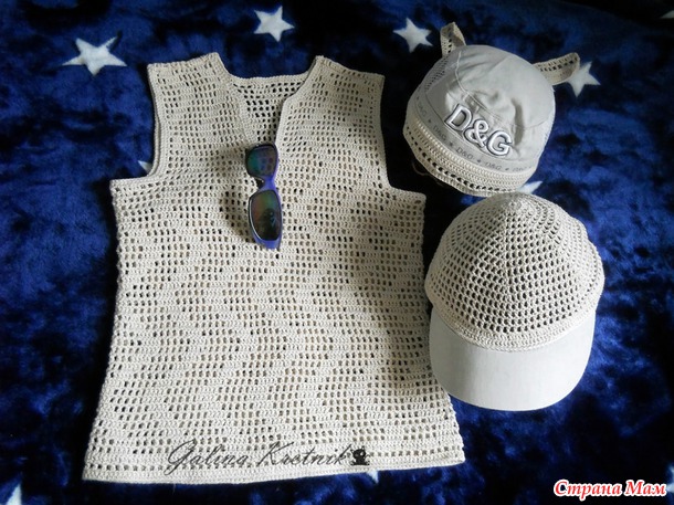 Майка связалась за пару-тройку дней, вяжется просто и быстро. К майке связала два головных убора: кепку и бандану.