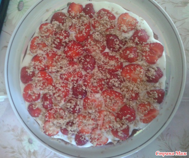 Теперь начинаем собирать наш торт. Корж смазываем сметанным кремом, укладываем на него порезанную клубничку, посыпаем тертыми грецкими орешками.
