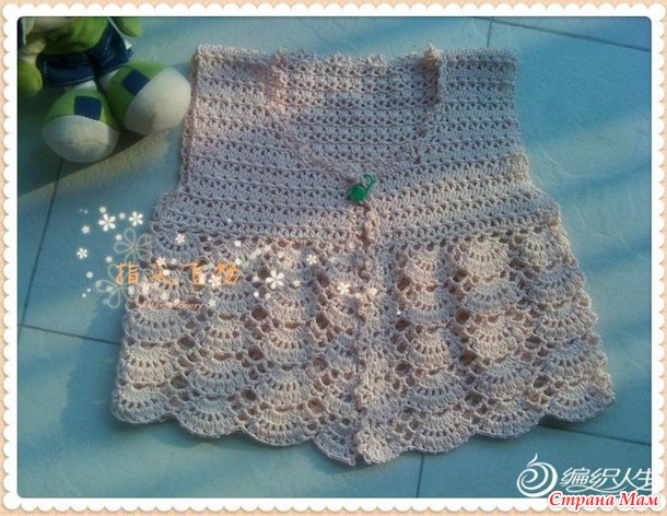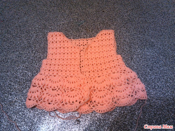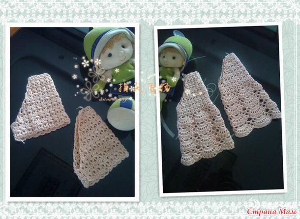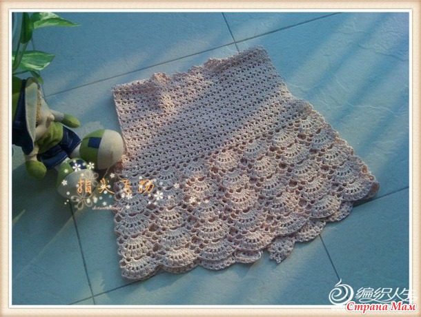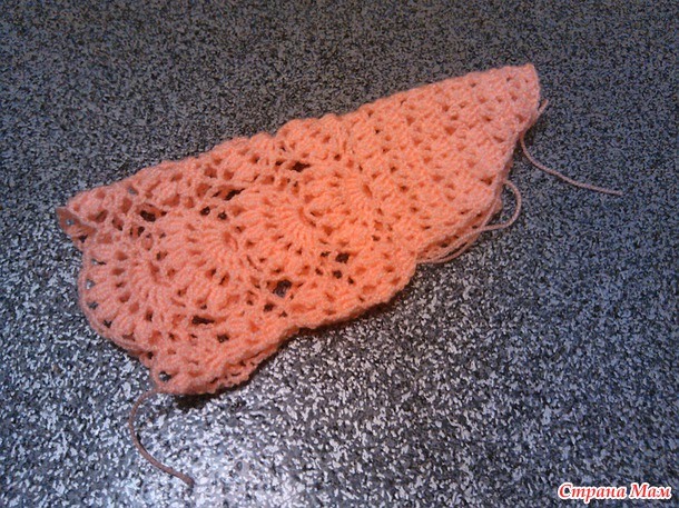 Небольшое примечание. Я обвязываю не точно по схеме. Дело в том, что если вы строго придержитесь схемы-получите ровное полотно, мне же хочется небольшой расклешенности. Поэтому, в первом ряду, я арочки вязала из 3 вп, через 2 петли, таким образом, количество веерочков увеличивается и мы получаем расширение