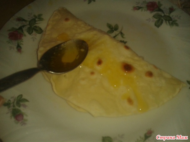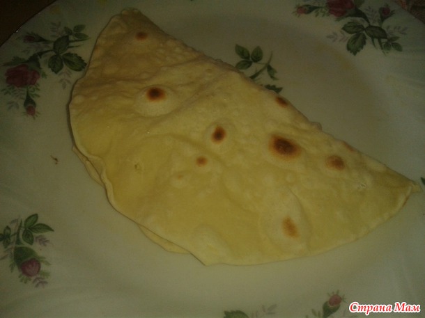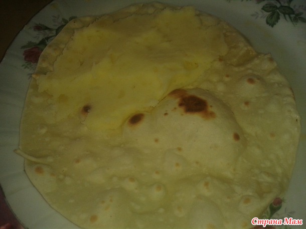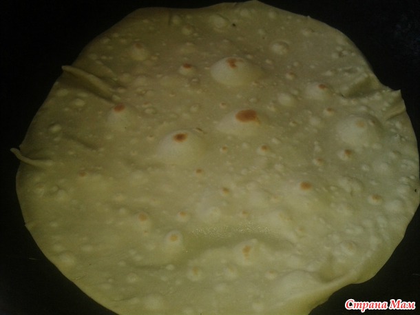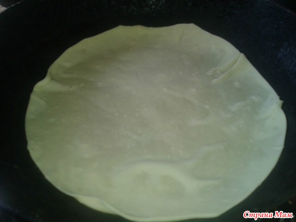 Раскатываем тонкую лепешку и обжариваем на сильном огне, на СУХОЙ сковороде
