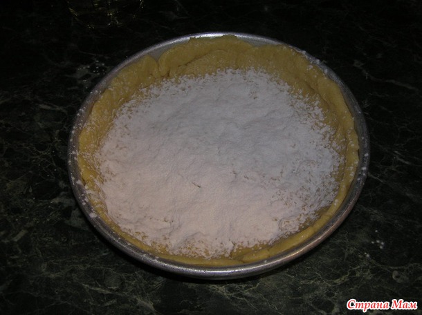 Тесто получилось мягким, с ним легко было работать, к рукам не липло. Мне даже не пришлось работать скалкой, раскатывая тесто, я просто размяла тесто по форме, сделав бортики. Поскольку варенье из абрикосов было не очень густое, то чтобы пирог пропекся и не был бы внутри влажным, я тесто чуть посыпала крахмалом, чтобы начинка "схватилась" и не текла.