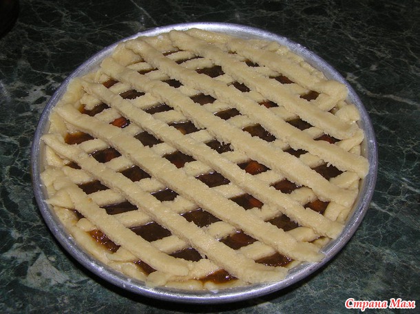 Поскольку тесто получилось мягким, то жгутики скрутить для решетки пирога у меня не получилось, и я решила просто раскатать тесто, ножом нарезать полоски и уложить их сеточкой на начинку.