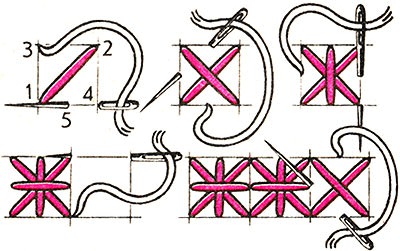Вышивка идет, как и простым крестиком в 4 приема: /, \, |, - в результате получается болгарский крест по лицу и буква К с изнанки.
