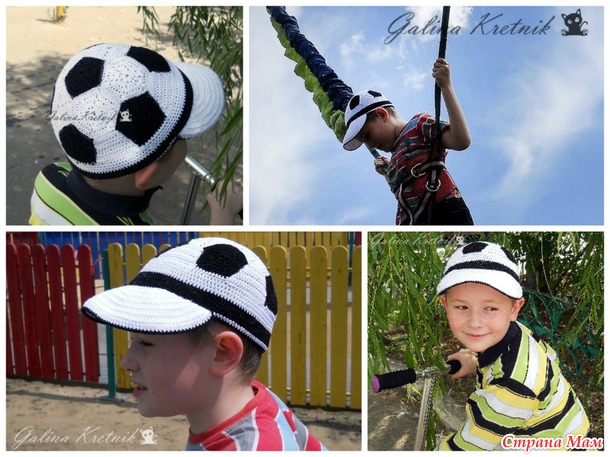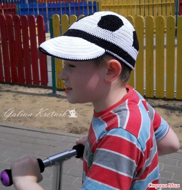 По заказу сына связала кепку-футбольный мяч, подобную зимней шапке https://www.stranamam.ru/post/6693307/.